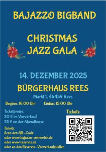 Wir haben für 2025 wieder viele tolle Konzerte geplant: das Jahr beginnt mit einem Tanzkonzert inklusive Tanzworkshop für das Publikum, das nach Lateinamerika entführt. Es geht weiter mit einer Hommage an Frank Sinatra – ein Konzert in Beek (NL), ein Konzert in Orsoy (Rheinberg). Am Jahresende gibt es auch noch ein swingendes Weihnachtskonzert im Bürgerhaus Rees.